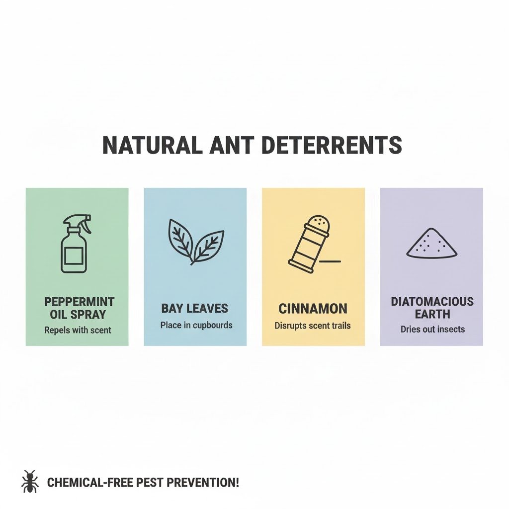 • Essential Oils: Peppermint, eucalyptus, tea tree, or citrus oils can disrupt ant trails. Mix with water and spray around entry points.