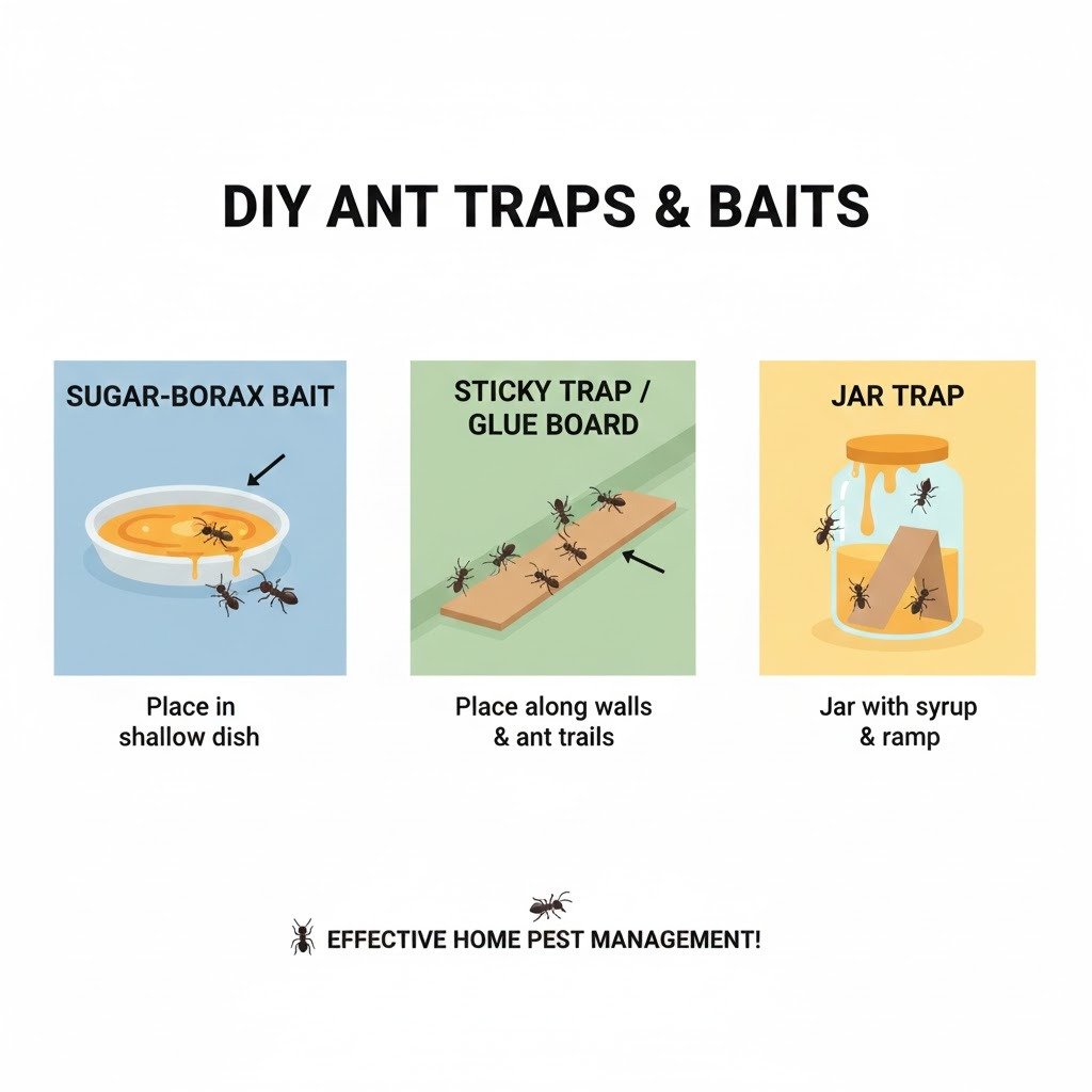 • Jar Traps: Use a small jar with syrup or honey and a ramp; ants enter but cannot escape.